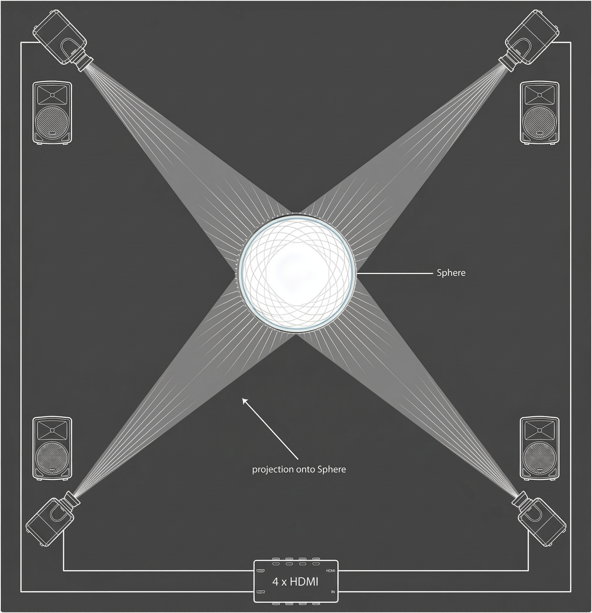 Four video projectors map real-time generative visuals onto the sphere's surface. A triangulated camera-based motion tracking system continuously monitors the sphere's subtle movements and adjusts the projection mapping accordingly, locking the digital imagery to the sphere’s surface so that it appears as a seamless, luminous skin. This fusion of physical instability and computational precision is central to the work's investigation: the tension between natural forces and machine intelligence.